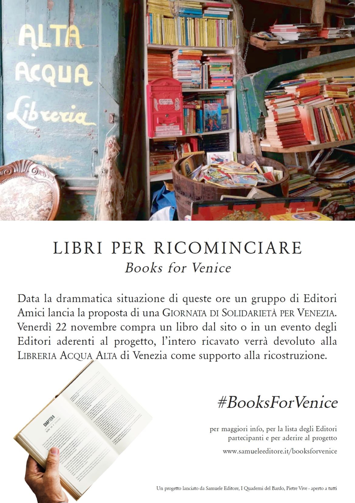 In un post sul suo profilo facebook in data 14 agosto 2019, Roberto Cotroneo scriveva “… la civiltà di un paese sta soprattutto nel dare valore alle cose, non il prezzo alle cose. In questo mondo dove tutto ha un prezzo e niente ha valore”. Estrapolata dal contesto in cui è stata inserita, questa sarebbe una semplice e buonista affermazione dal puro valore soggettivo, ma in realtà la questione affrontata da Cotroneo riguardava un sistema editoriale italiano che è saltato per varie ragioni che non è il momento però di approfondire in questa sede. Ma non è solo il sistema editoriale a essere saltato nel nostro bel paese: vedasi l’agonizzante eco-mostro dell’Ilva a Taranto che sarà un gigantesco buco nero per l’economia italiana, al quale si aggiungono le devastanti condizioni atmosferiche che riducono in ginocchio patrimoni dell’umanità come Venezia. E proprio per Venezia al “grido” di #BooksForVenice, data la drammatica situazione di queste ore, un gruppo di Editori Amici (Un progetto lanciato da Samuele Editore, I Quaderni del Bardo, Pietre Vive – aperto a tutti) lancia la proposta di una Giornata di Solidarietà per Venezia. Venerdì 22 novembre compra un libro dal sito o in un evento degli Editori aderenti al progetto, l’intero ricavato verrà devoluto alla Libreria Acqua Alta di Venezia come supporto alla ricostruzione.