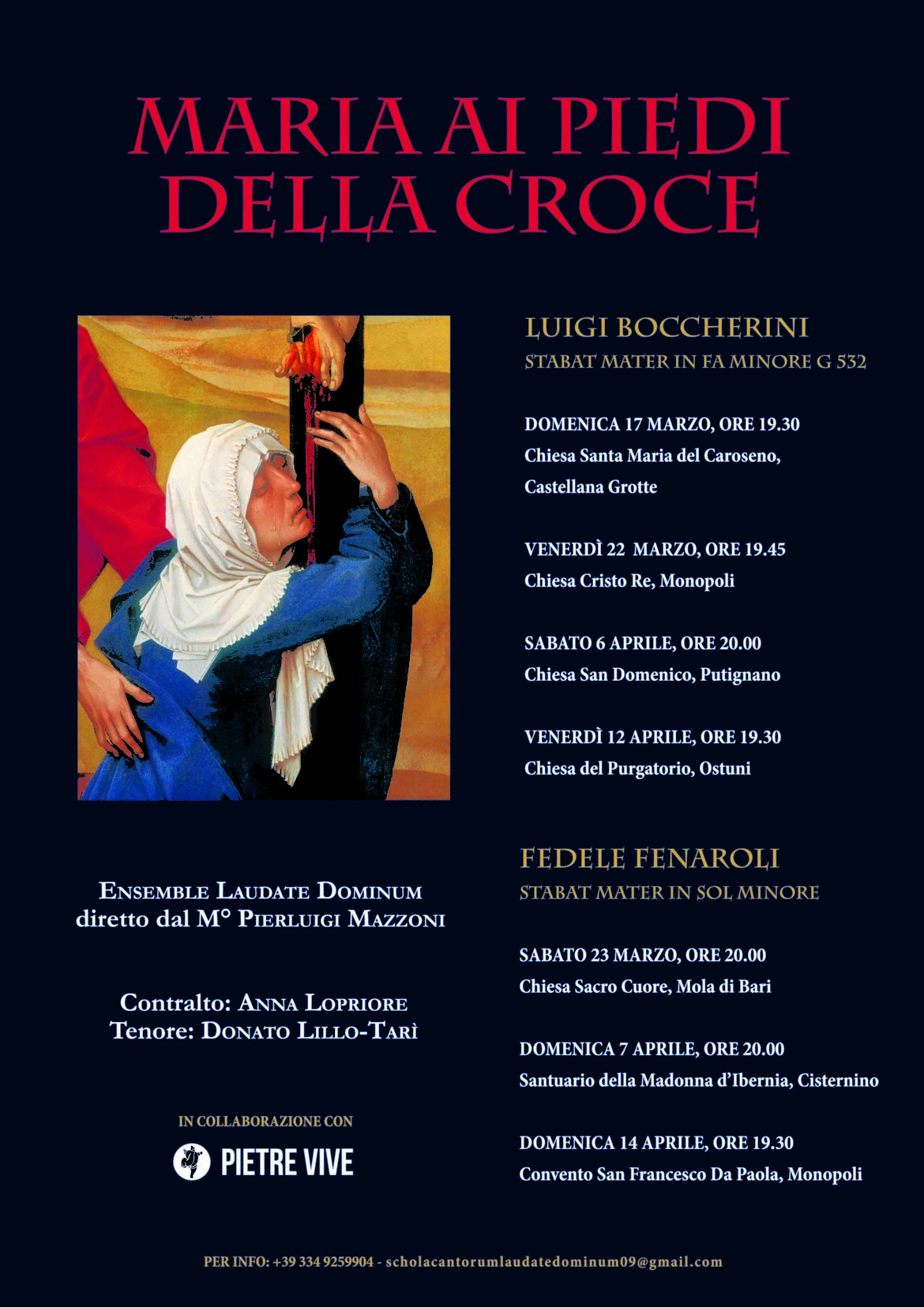 Si comincia dunque, il 17 marzo, con la rassegna dal titolo “Maria ai piedi della croce”, un ciclo di 7 concerti che vedranno alternarsi tre appuntamenti con lo “Stabat Mater” di Fedele Fenaroli per due voci, orchestra d’archi e basso continuo; e quattro appuntamenti con lo “Stabat Mater” di Luigi Boccherini per voce sola, orchestra d’archi con organo.